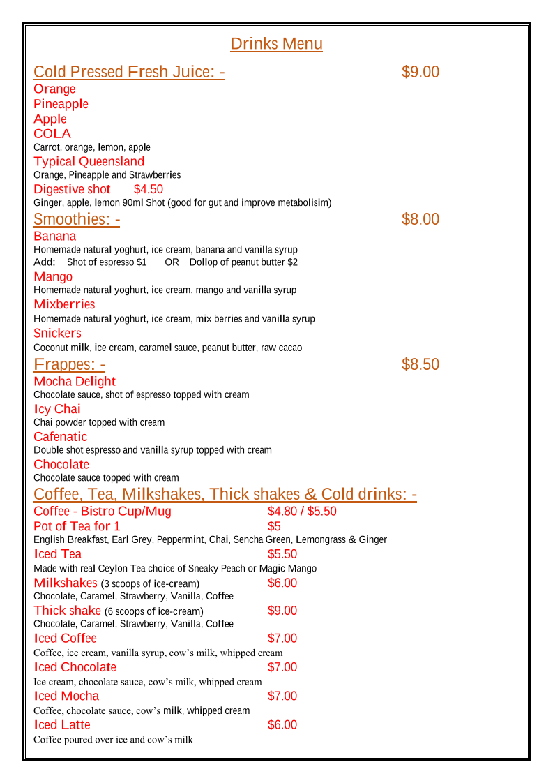 - Frappes: Indulge in a Mocha Delight or try the Icy Chai—each one crowned with rich cream for a decadent treat.